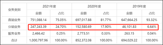 2021年,建发致新收购建发股份子公司德尔医疗。收购德尔医疗后,建发致新的分销业务大幅提升,由2019年的6.64%的收入占比上升至2021年的24.7%,分销业务的收入由2019年的4.61亿元上涨至2021年的24.72亿元。