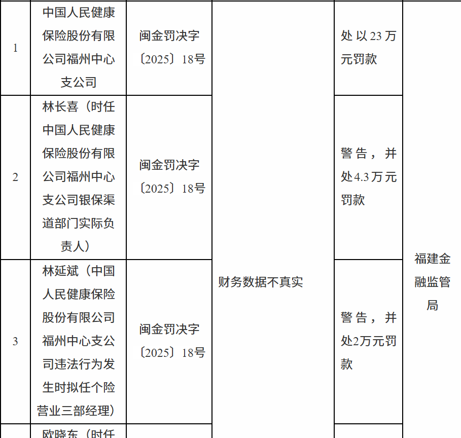 10月21日,福建金融监管局行政处罚信息公示表显示,中国人民健康保险股份有限公司福州中心支公司因财务数据不真实被处以23万元罚款;林某喜被警告,并处4.3万元罚款;林某斌被警告,并处2万元罚款;欧某东被警告,并处1万元罚款。