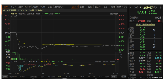 1月26日,思林杰低开1.8%,开于49.1元/股,开盘后公司股价保持低位震荡态势,盘中一度跌超7%。截至当日收盘,公司股价收跌5.92%,收于47.03元/股,总市值31.36亿元,当日成交金额1.85亿元。拉长时间线来看,1月19日—26日这6个交易日内,思林杰股价区间累计跌幅达33.84%,而同期大盘涨幅为0.75%。