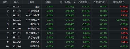 主力资金流出的板块分别是证券、计算机应用、有色冶炼,主力资金流出金额分别为93.10亿元、69.30亿元、37.66亿元,其中散户净流入金额为30.34亿元、6.52亿元、5.87亿元。