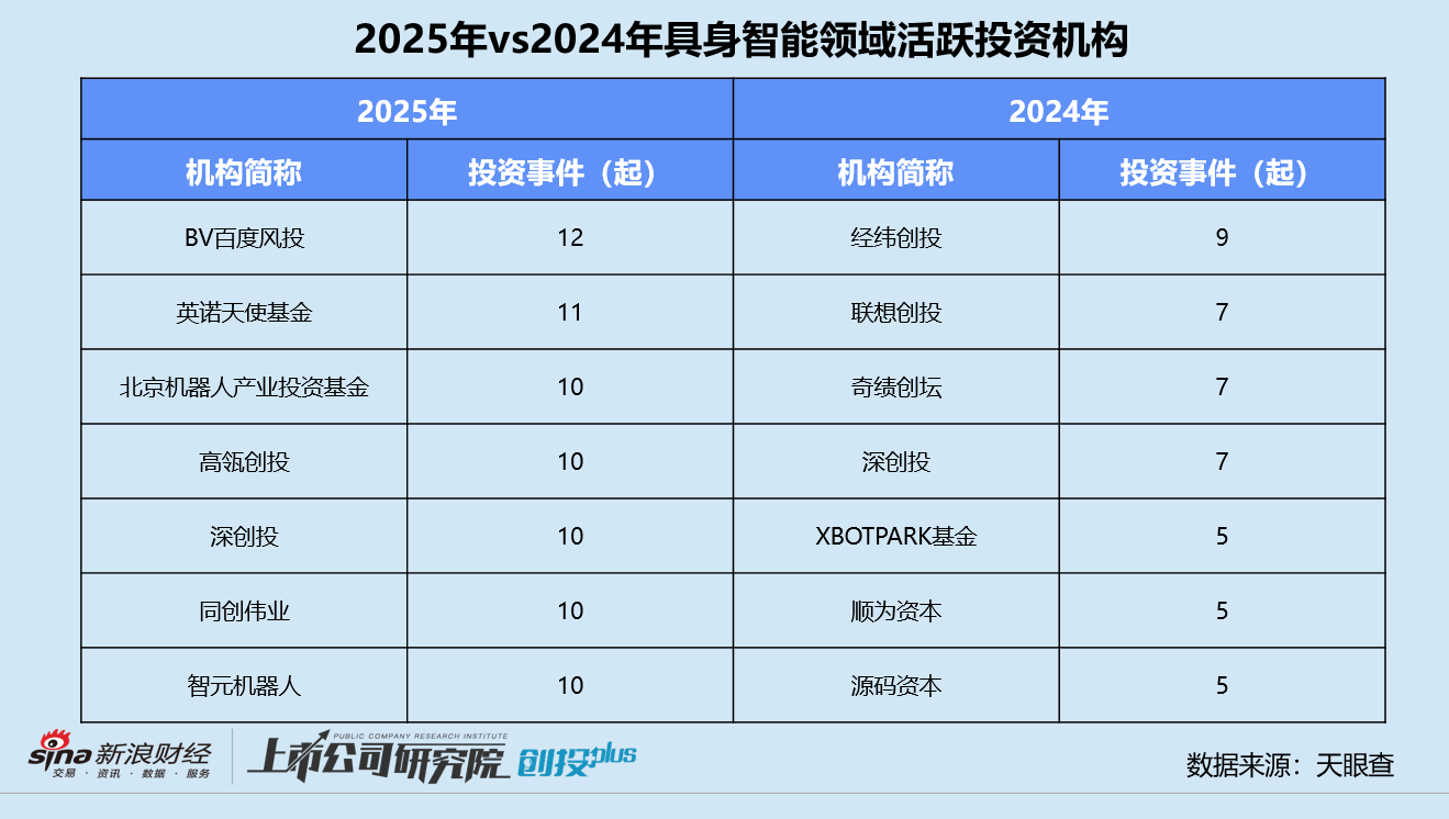 统计区间内,共有7家股权投资机构参投具身智能公司超10次,而2024年在该领域最活跃的经纬创投,公开披露的投资仅为9次。BV百度风投出手12次领跑,远超其他CVC机构,约占当期机构投资总数的57.1%。深创投2024年和2025年皆榜上有名,分别参投7次、10次。独角兽企业「智元机器人」已开始投资孵化产业链上的“小独角兽”,年内共完成10起投资,覆盖多模态感知决策系统、机器人传感器等方向。