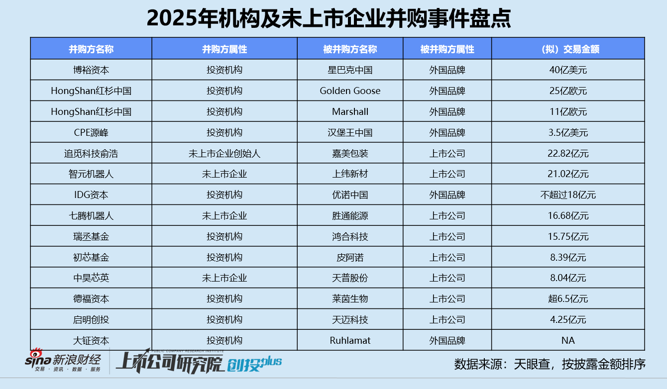 其二是投资机构或独角兽企业并购上市公司。启明创投斥资4.25亿元收购智能公共交通解决方案提供商「天迈科技」,不仅意味着国内股权投资机构首次以并购方式深度介入上市公司,更标志着传统成长型基金开始系统性进入并购赛道。随后,初芯基金以8.39亿元入主定制家居企业「皮阿诺」,目标持股29.99%;德福资本收购甜味剂公司「莱茵生物(维权)」,并将核心资产食品营养强化剂企业「金康普」注入上市公司;奇瑞集团旗下的CVC机构瑞丞基金凭借15.75亿元,一跃成为教育科技公司「鸿合科技」的控股股东。