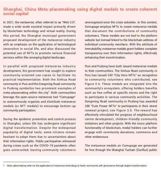 而在数字化转型方面,上财MSW中心师生实践使用数字徽章凝结社会信任,激发社区参与。数字徽章是基于区块链技术的新型产物,具有分布式和不可篡改的特性。实践发现数字徽章能够有效记录社会贡献,标识社群身份,使得社区成员更具参与热情与荣誉感。这一案例也是在全球范围内元宇宙推动真实社区营造的具体例证,实现了元宇宙社区营造的第一步。