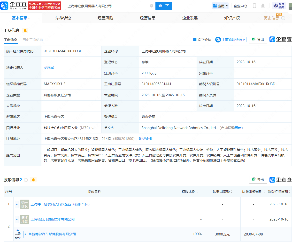 近日,上海德迩象网机器人有限公司成立,法定代表人为罗来军,注册资本为2000万元,经营范围包含:智能机器人的研发;智能机器人销售;工业机器人销售;服务消费机器人销售;人工智能硬件销售等。企查查股权穿透显示,该公司由上海德一创驭科技合伙企业(有限合伙)、德尔股份(300473)全资子公司上海德迩几微新技术有限公司共同持股。