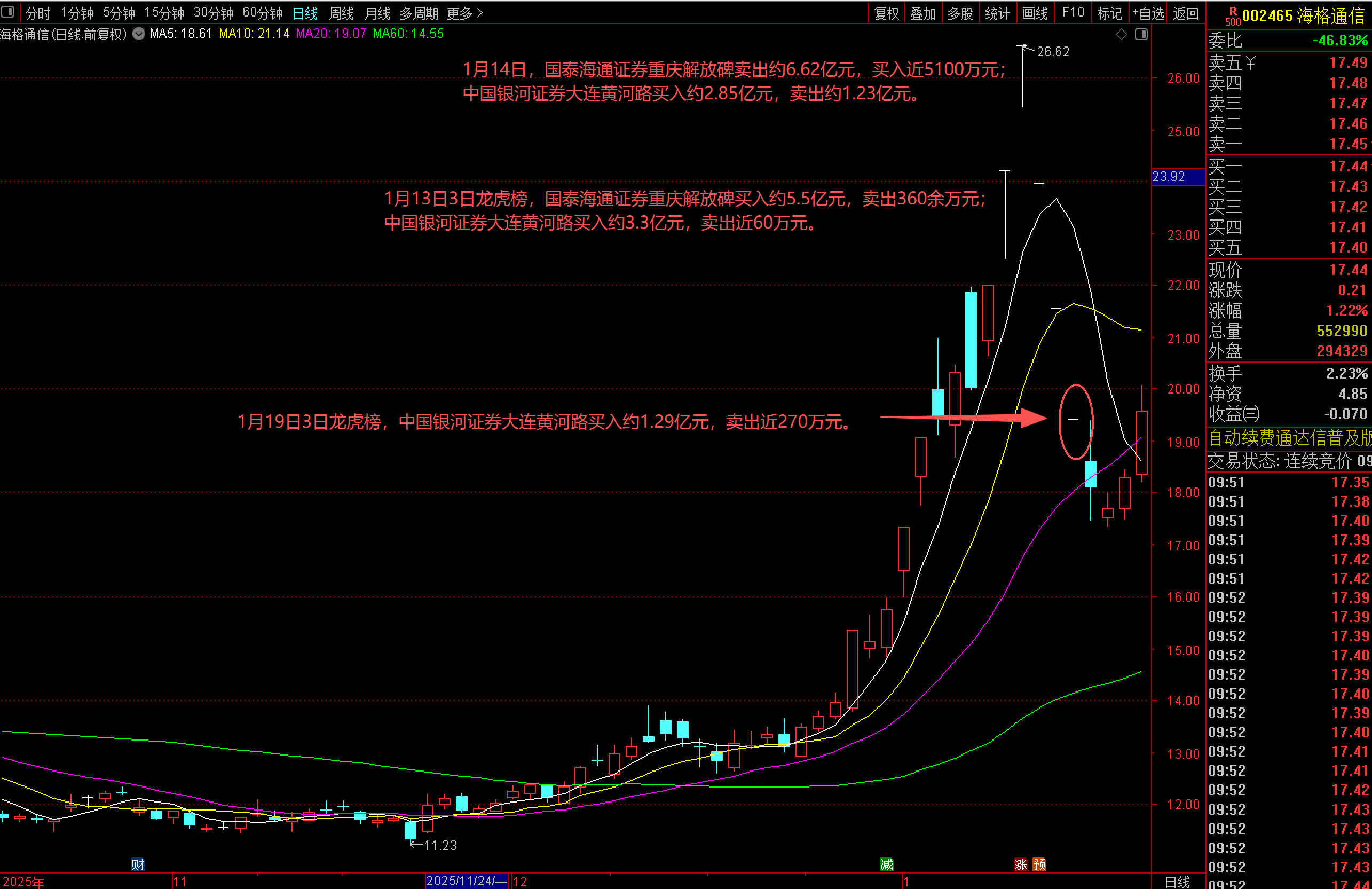 海格通信1月13日披露的3日龙虎榜数据显示,国泰海通证券重庆解放碑和中国银河证券大连黄河路买入金额分别高达5.5亿元和3.3亿元;次日,中国银河证券大连黄河路继续买入2.85亿元,卖出1.23亿元,国泰海通证券重庆解放碑则大举卖出6.62亿元,同时买入近5100万元。随后,海格通信3连跌停,1月19日披露的3日龙虎榜数据显示,中国银河证券大连黄河路买入1.29亿元。