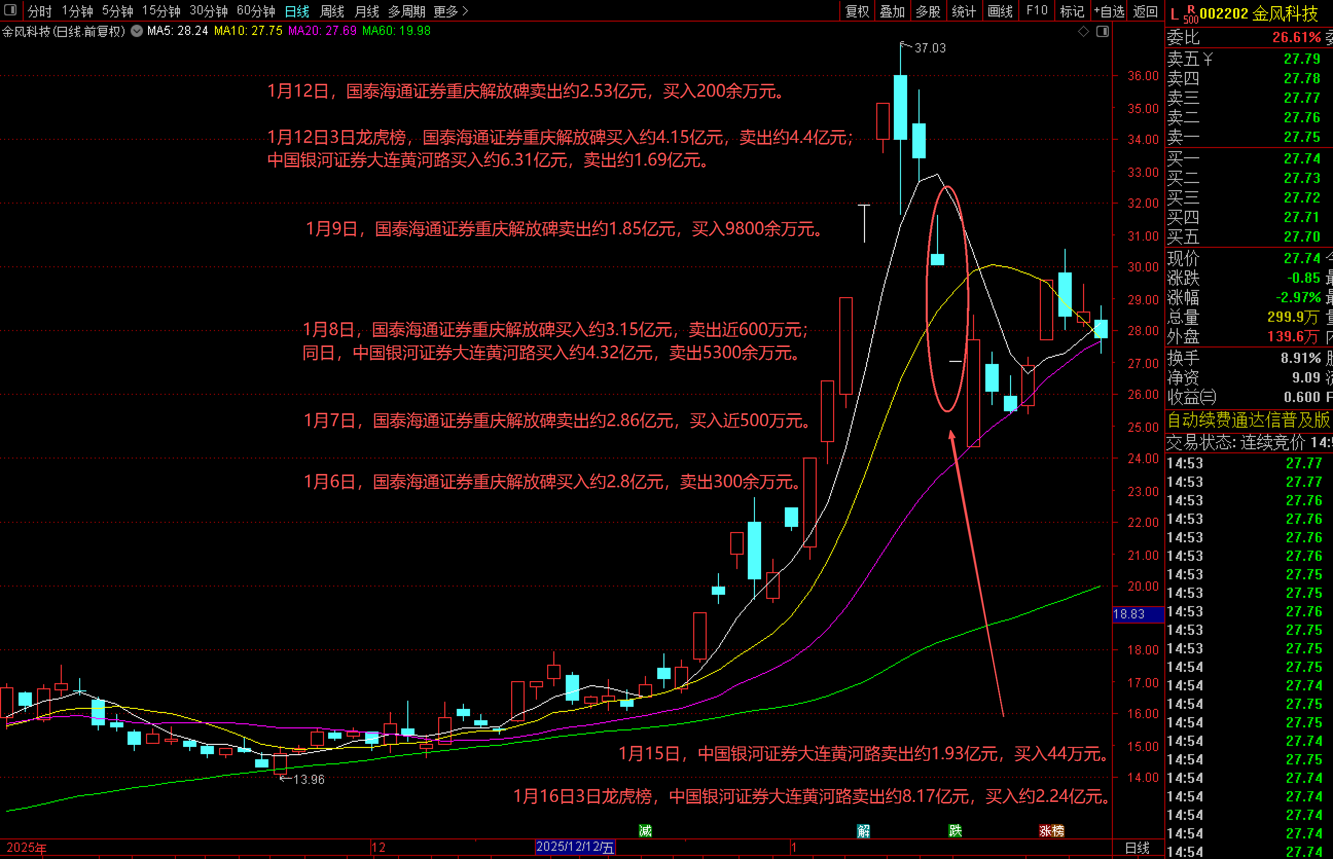 今年1月6日至1月12日,金风科技强势5连板,随后在1月13日盘中刷出阶段高点37.03元/股以后股价开始回调,并在1月15日至1月16日2连跌停。