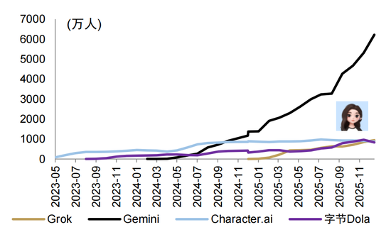 2025年底其日活跃用户数(DAU)已突破千万,已成为在海外具备稳定用户规模的第二梯队AI应用(和Grok、Character.ai量级相当)。根据Sensor Tower,截至2025年12月,Dola MAU合计达到5,593万人。