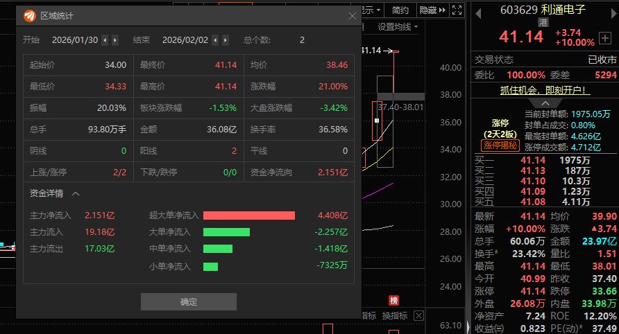 截至2日收盘,利通电子仍有1975.05万元的封单额,最高封单额4.646亿元,并在涨停板上成交了4.712亿元,全天成交23.97亿元,换手率23.42%。1月30日~2月2日,利通电子收获“两连板”,股价累计上涨21%。
