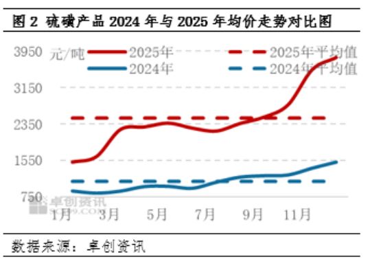 来自卓创资讯的数据显示,硫磺市场价格2025年平均值为2474.66元/吨,全年均价同比暴涨126.65%。2025年末,硫磺价格创近十年新高。